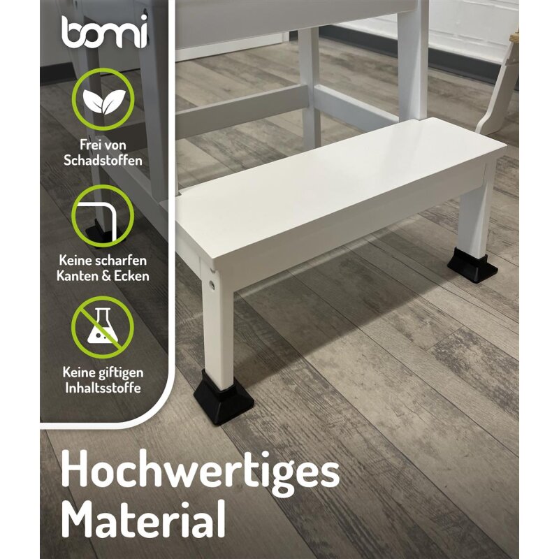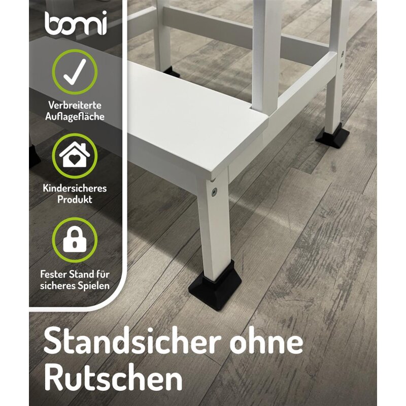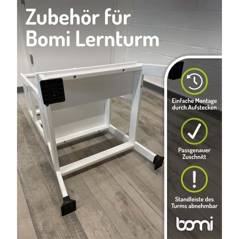 Das Zubehör für Kinderlerntürme passt ausschließlich auf den Learning Tower Swubi der Marke bomi. Die Ecken & Kanten von den Stehfüßen in Schwarz sind abgerundet und natürlich schadstofffrei.