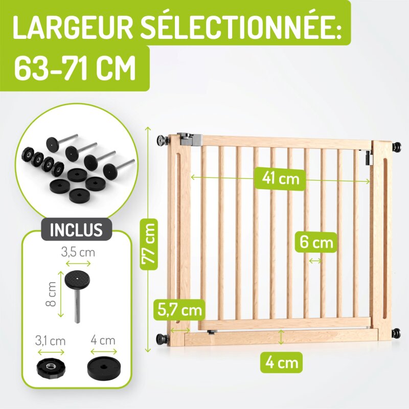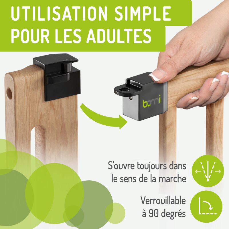 Grâce à la fixation par pression, la barrière Miko XXL s’installe en quelques minutes, sans outils et sans percer. Quatre points de pression antidérapants assurent une fixation stable dans l’encadrement de porte ou en haut/bas de l’escalier, sans abîmer vos murs ou surfaces en bois.