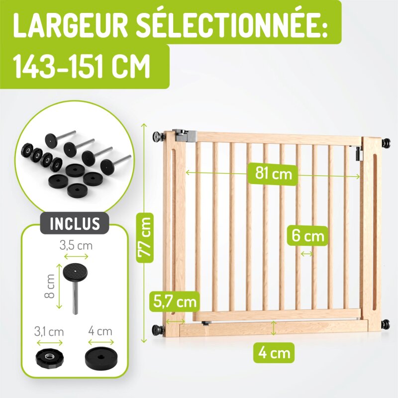 Grâce à la fixation par pression, la barrière Miko XXL s’installe en quelques minutes, sans outils et sans percer. Quatre points de pression antidérapants assurent une fixation stable dans l’encadrement de porte ou en haut/bas de l’escalier, sans abîmer vos murs ou surfaces en bois.