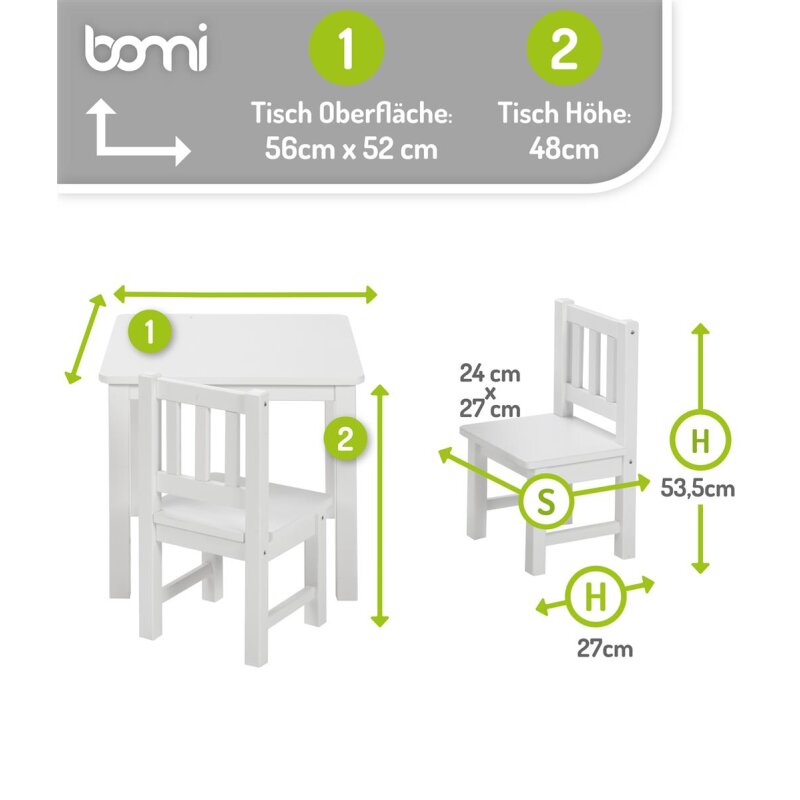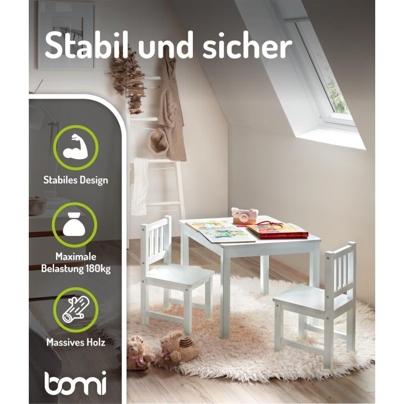 Fabriqués en bois massif robuste, la table et les chaises sont durables et très stables. Les surfaces sont recouvertes de peintures adaptées aux enfants selon la norme DIN EN 71-3 – résistantes à la salive, sûres et sans substances nocives.