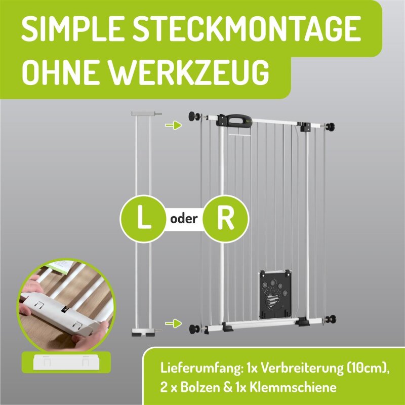 L’extension peut être installée au choix à gauche ou à droite de la barrière existante. Le montage est entièrement sans outil et se fait en quelques secondes – parfait pour les foyers recherchant une solution flexible et rapide.